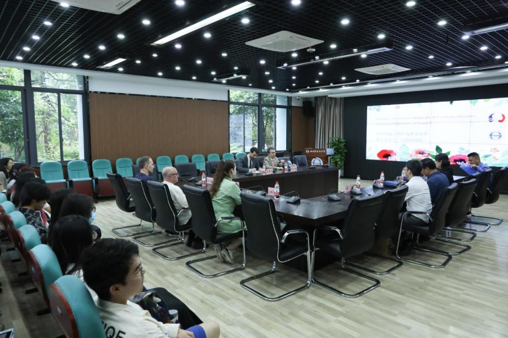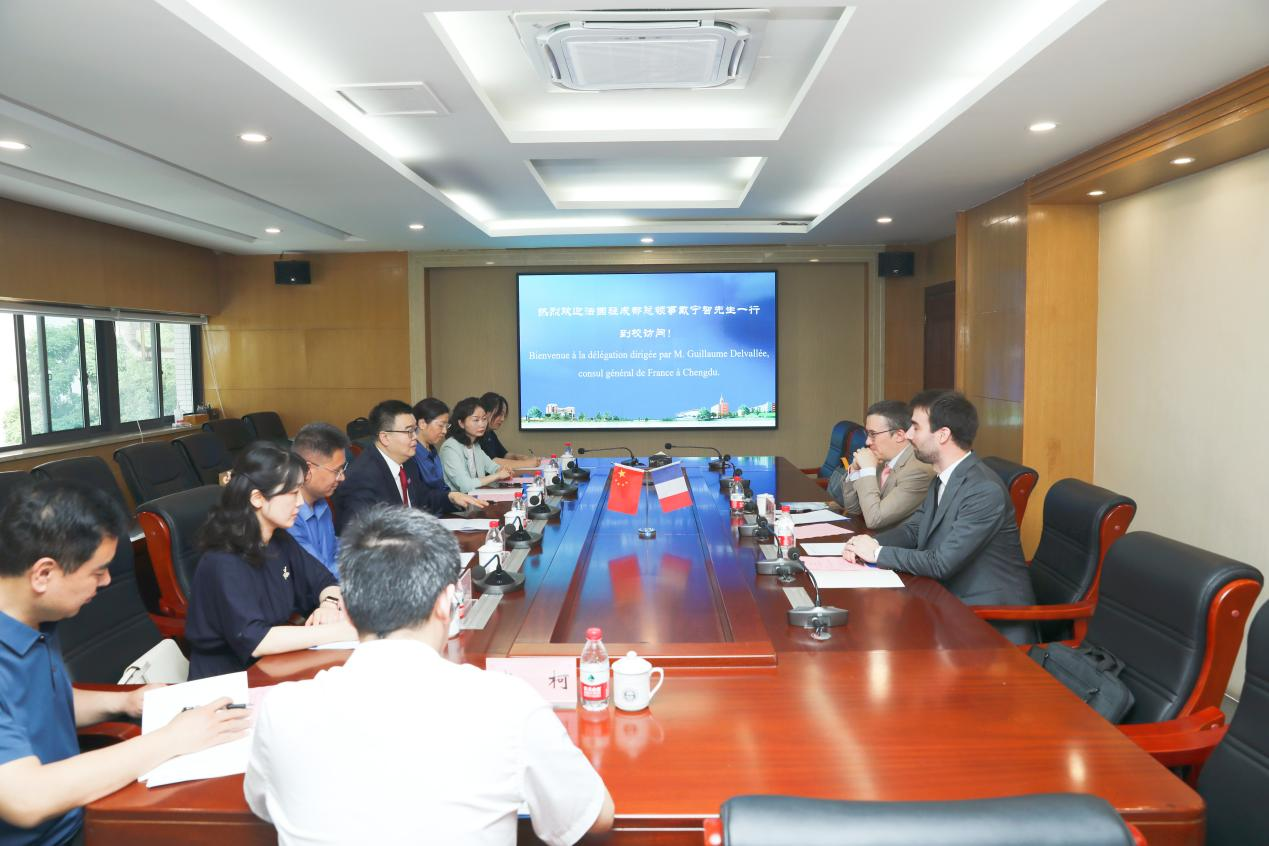 5月4日上午,法国驻成都新任总领事戴宁智(Guillaume Delvallée )、法国高等教育署成都中心负责人李奥力(Pierre - Olivier CAMARET )访问公司。公司董事长董洪川在西区立德楼A301会见来宾,国际合作与交流处、法语学院和beat平台相关负责人共同参与会谈。